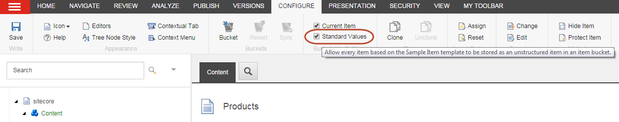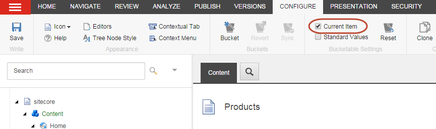 ConfigureタブのBucketable Settingsグループで、Standard Valuesチェックボックスを選択し、選択したアイテムのテンプレートに基づくすべてのアイテムをバケット化します。