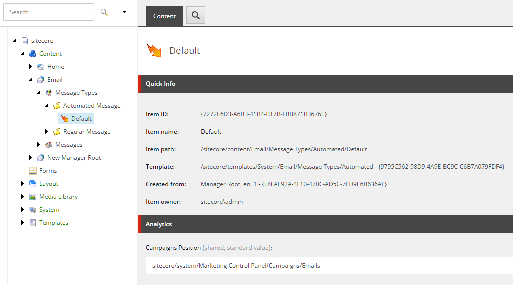 To configure the general settings of the email campaign types, edit the Default item in the corresponding folder.