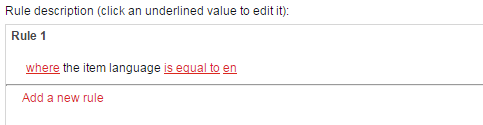 5. Select the conditions for your rule. For example, to create a rule that boosts all items in English, in the Item Version section, select the where the item language compares to value condition from the list and then edit the condition as follows: