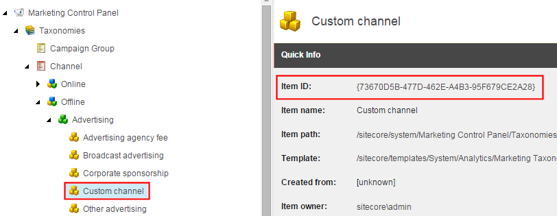 6. In the Sitecore installation where you have created your custom channel, open the Content Editor and navigate to the channel node and copy the Item ID of the custom channel item: