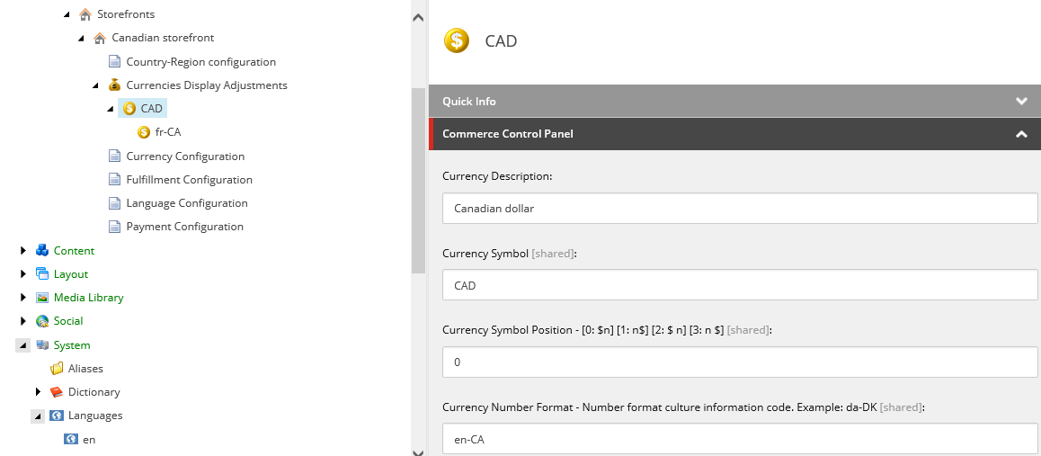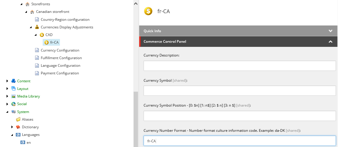 Select the Currency item that you just created and insert a Currency Display item. Name the item with the relevant culture code (for example, fr-CA) and fill in any fields that differ from the parent item.