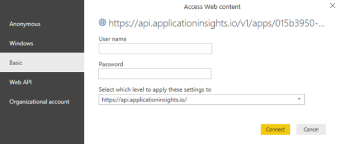 Power BI prompts you for authentication. The default authentication is Anonymous, however, you must change it to Basic.