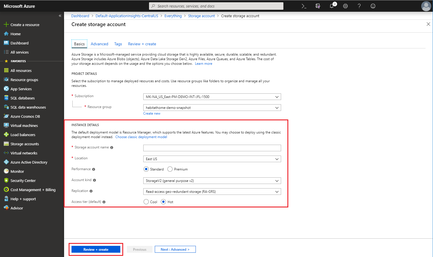 Under Create storage account, Instance details, fill in your details, and click Review + create, then review your details and click Create.