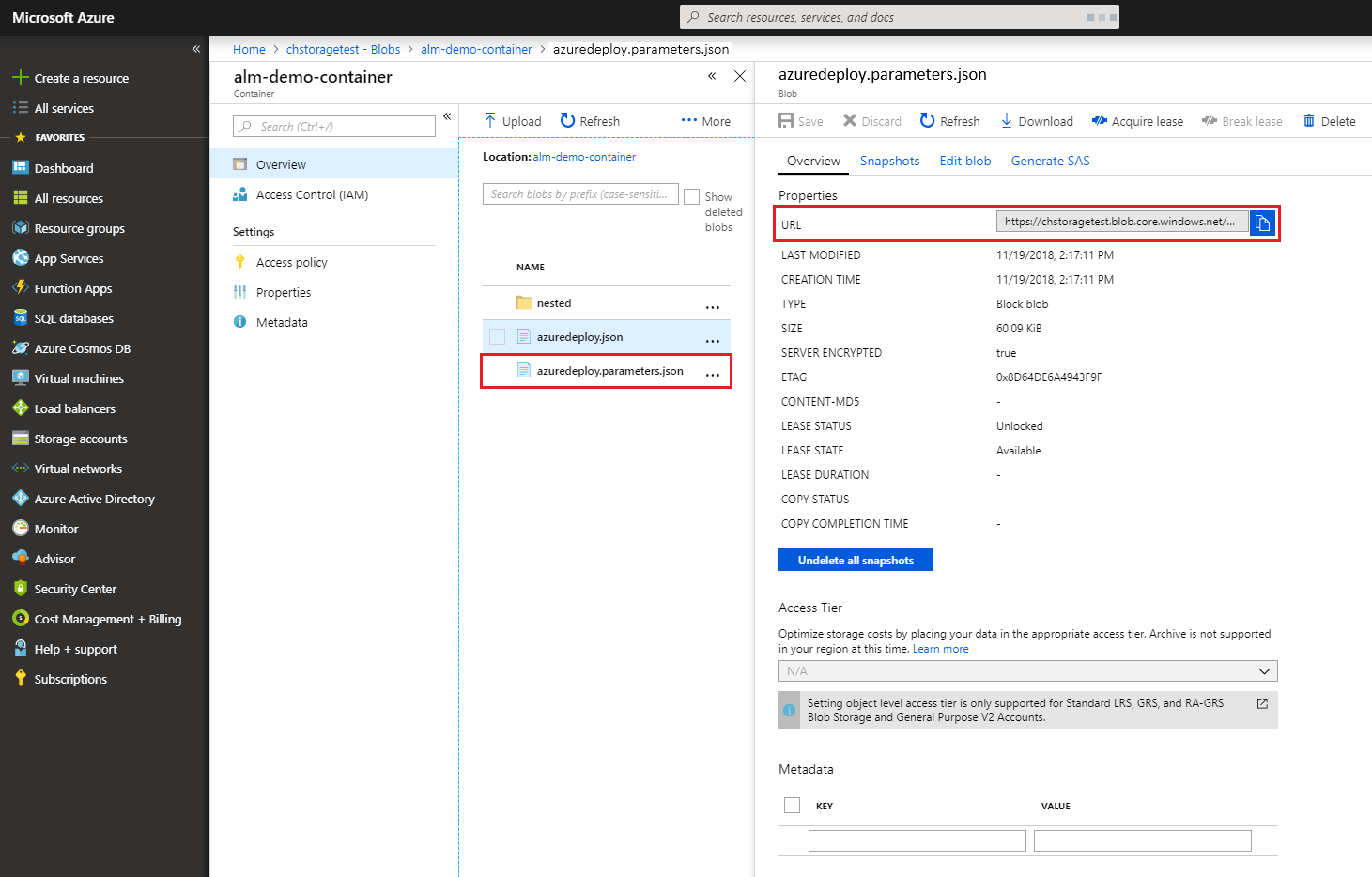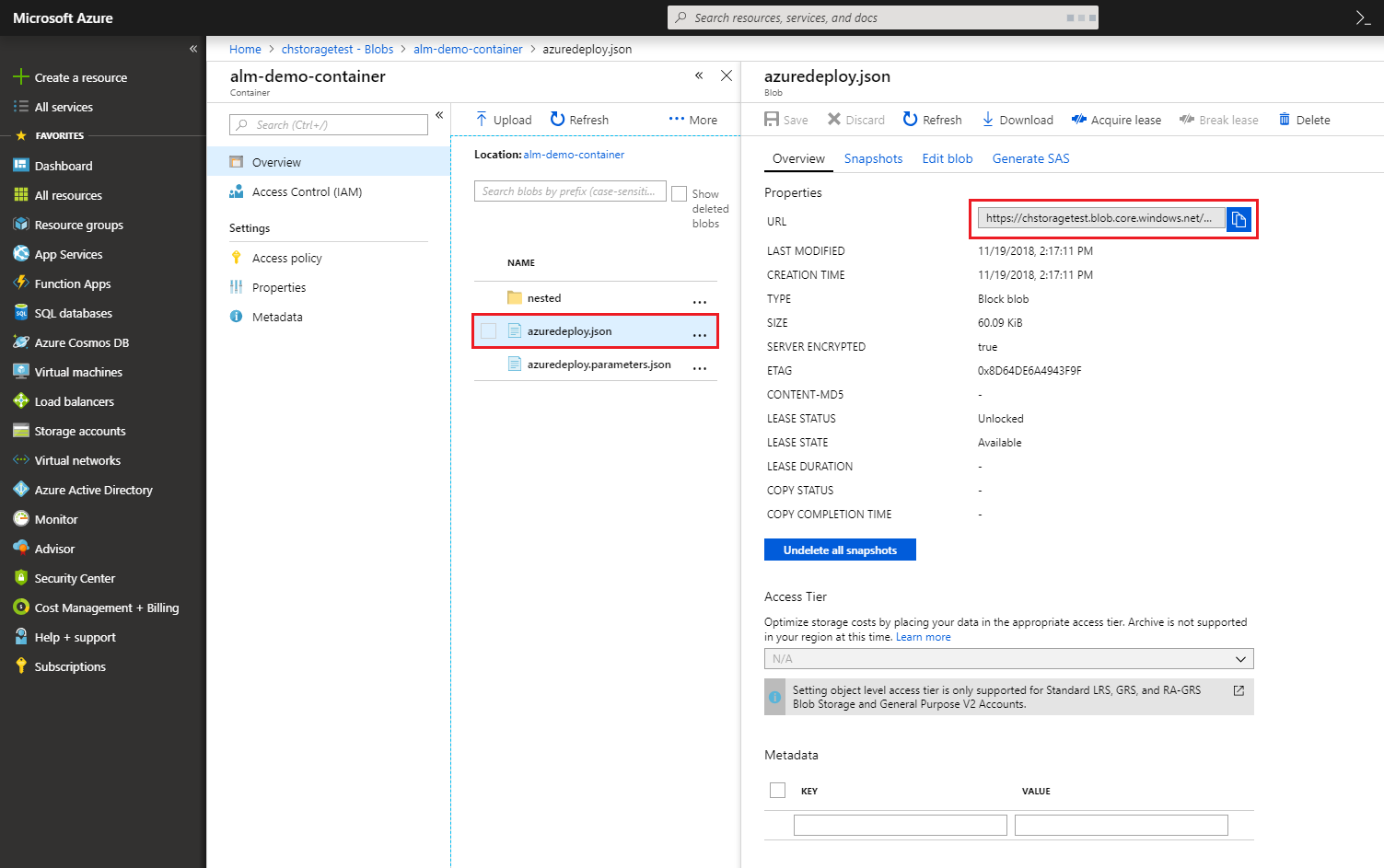 In the Properties section, in the URL field, copy the azuredeploy.json URL and record it for later when you deploy the Azure Monitoring and Alerts Basic ARM templates.
