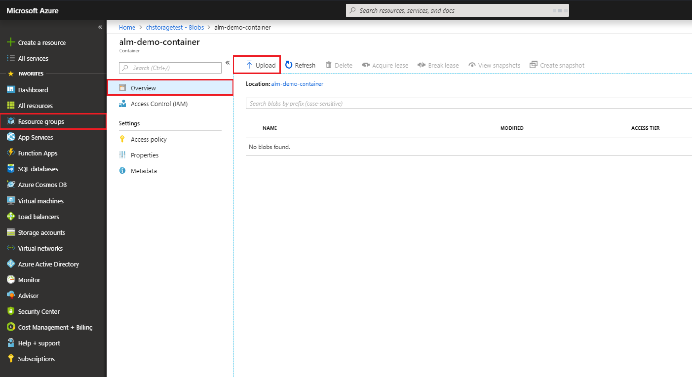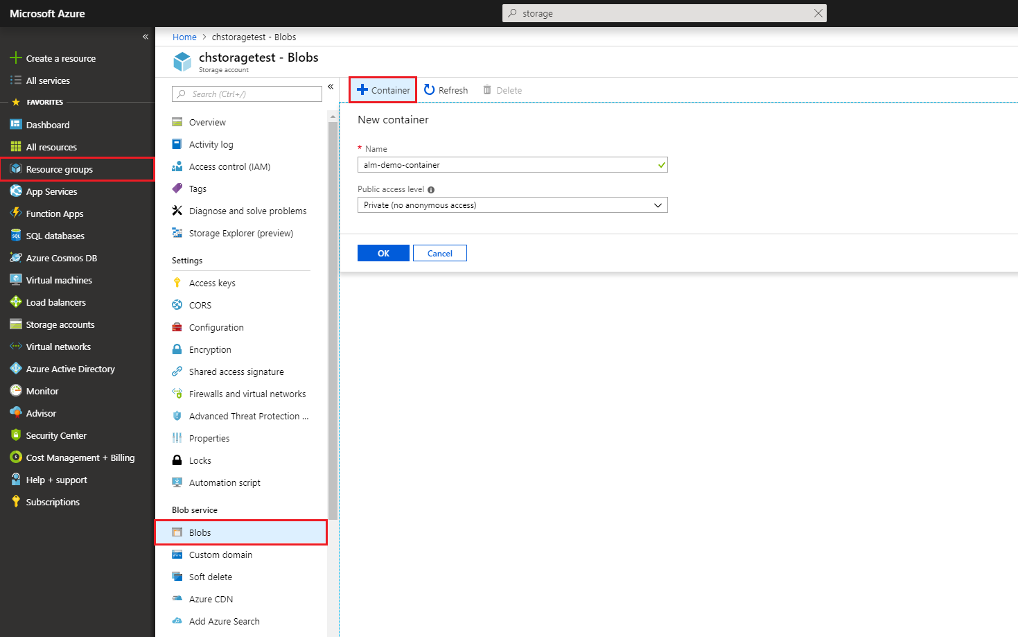 Under Blob service, Blobs, click +Container, then, under New container, fill in the name of the new container, and click OK.