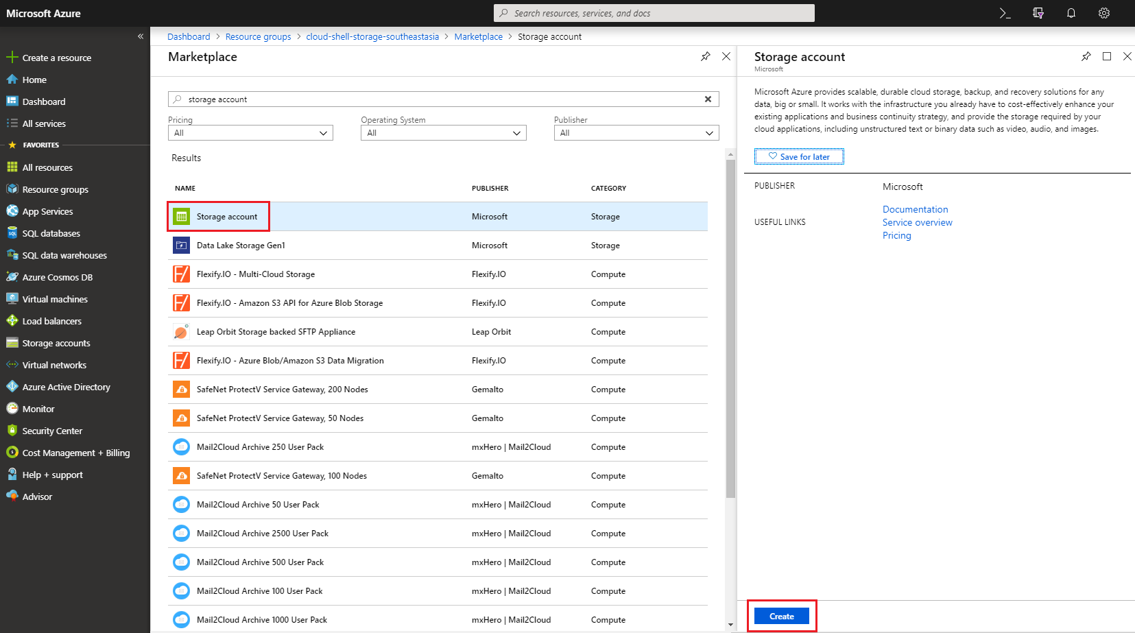 In the Marketplace section, search for "storage account", click Storage account, then click Create.