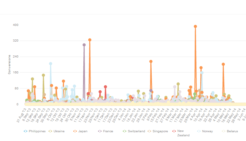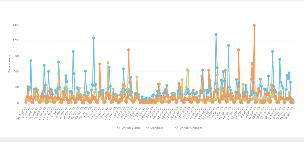 In Experience Analytics, when you open a report there are several metrics, keys or segments displayed along each of its axis. In the following example, the report shows conversions by country. Each country is represented as a different key.