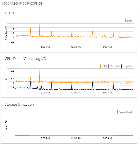 DTU % (Database Throughput Unit percentage) - Microsoft calculates DTUs based on a blended measure of CPU, memory, reads, and writes. The DTU % shows the percentage of units used by this particular database. When the DTU % grows close to or beyond 100%, you might want to increase the performance level of the corresponding server.