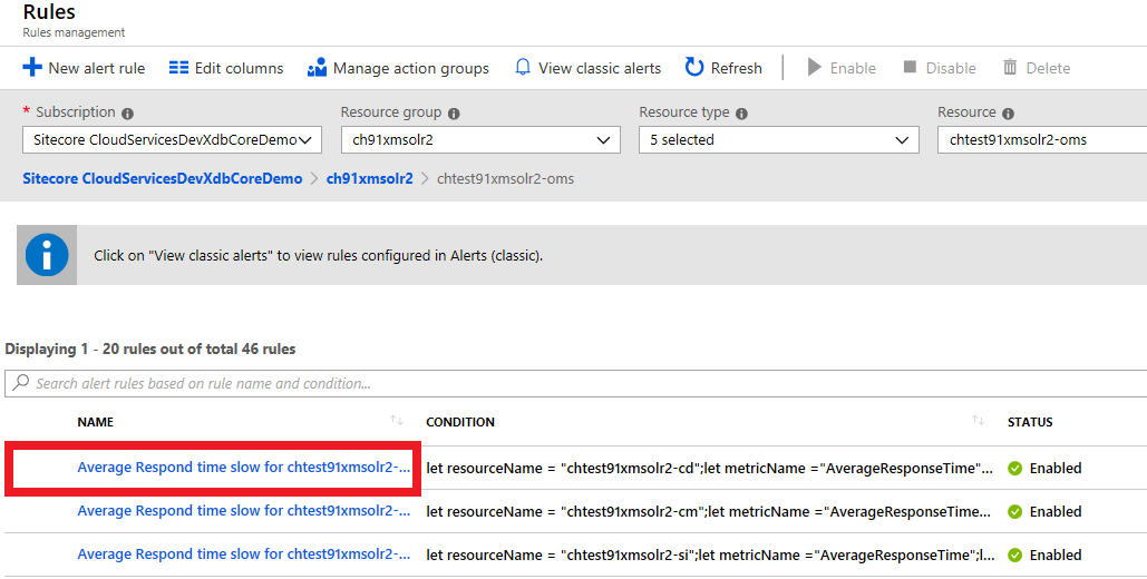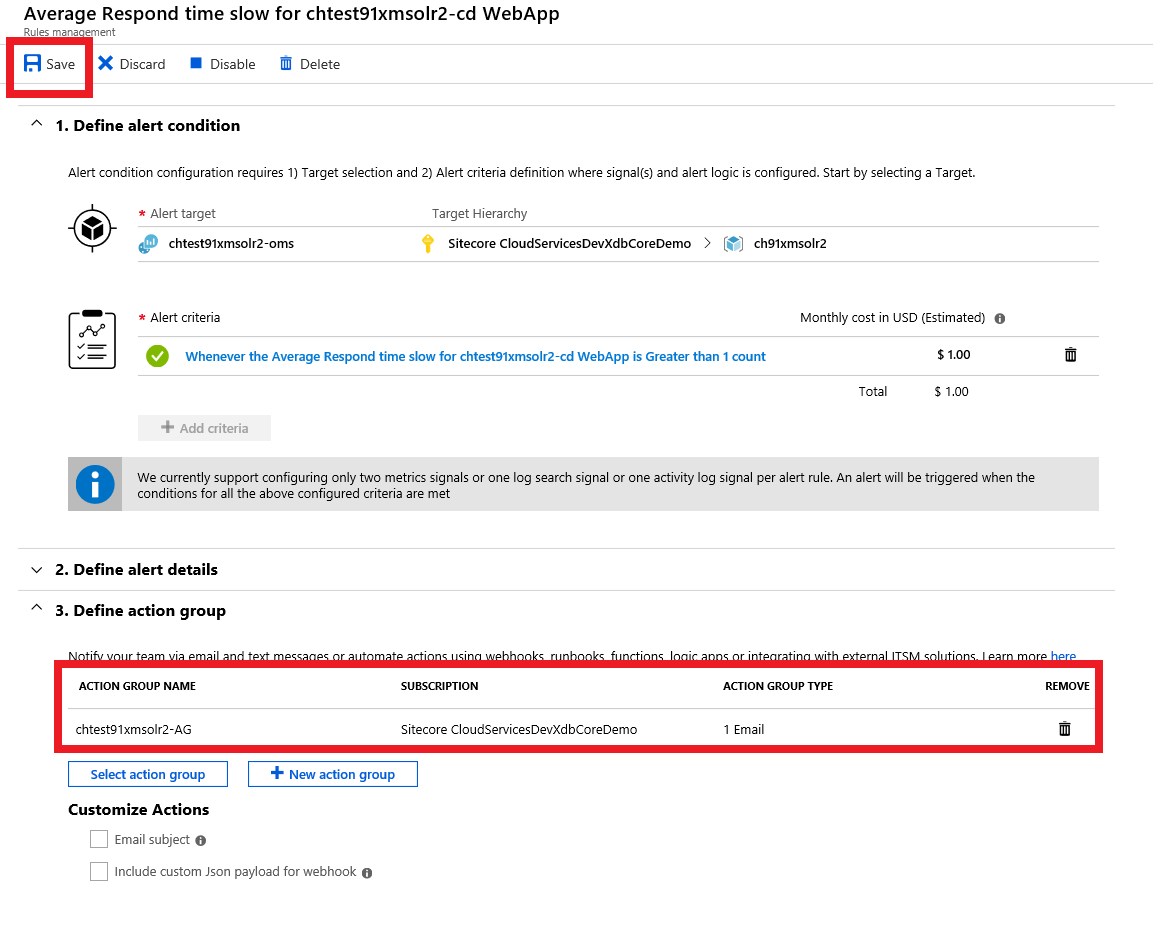 To ensure your alert email messages contain information that is bespoke for your solution, you can specify the type of details that you receive in alert email messages. You can update your alert rules by clicking on the names of the alerts that you want to edit and defining the alert conditions and details, as well as the the action group, in Rules Management.