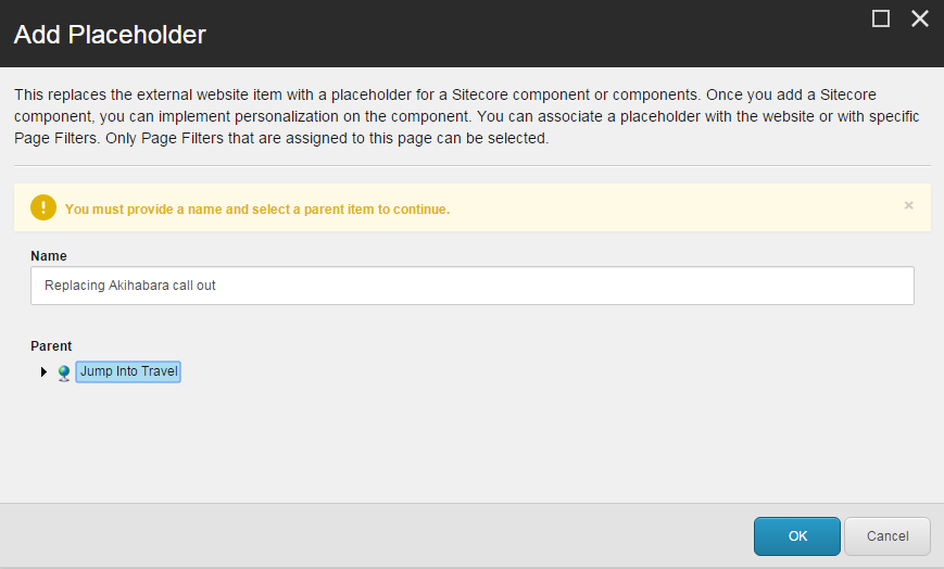 In the Add Placeholder dialog box, in the Name field, enter a name for the new component, such as Replacing Akihabara call out. In the Parent field, click a parent item and then click OK.