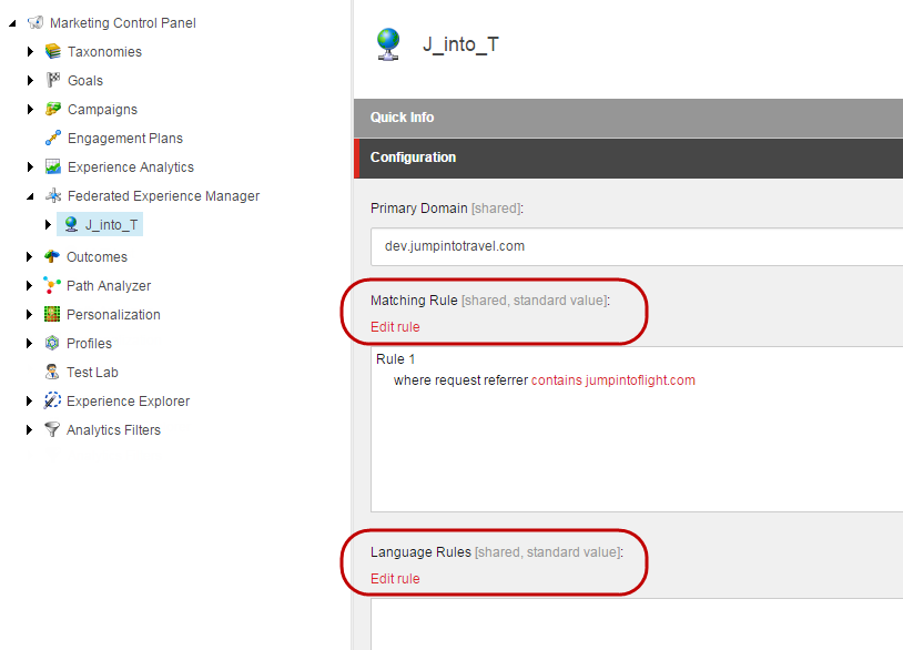 Under the Configuration section, in the Matching Rules or Language Rules section, click the link Edit rule, and in the Rule Set Editor dialog, add the relevant rules and actions.