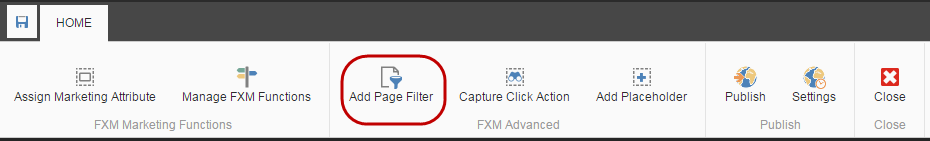 In the Experience Editor, navigate to the page you want to assign the page filter to, on the Home tab, in the FXM Advanced group, click Add Page Filter.