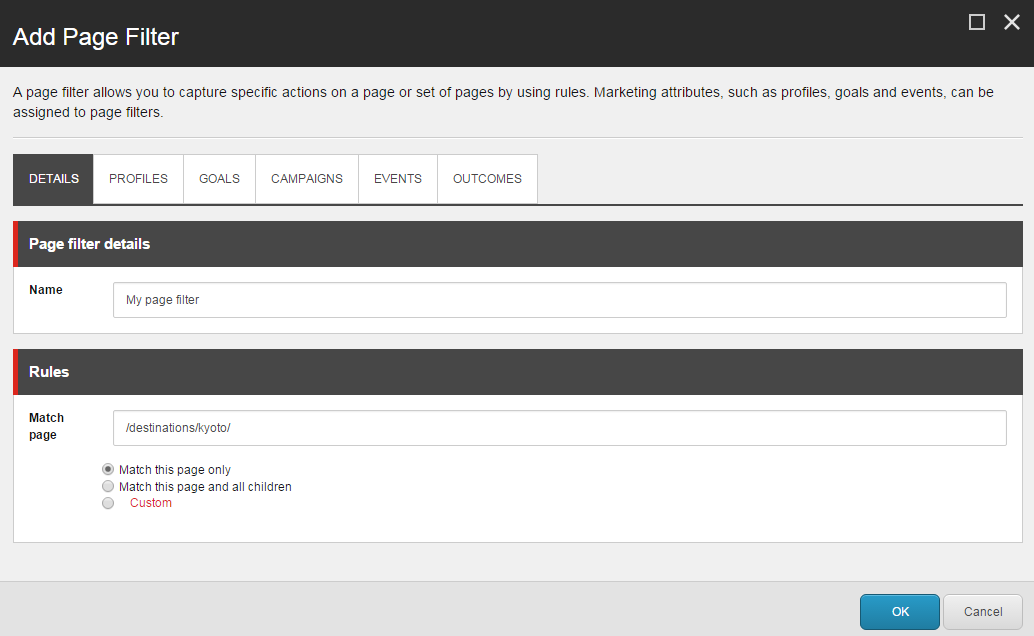 In the Add Page Filter dialog box, enter the name of the page filter and under Rules, in the Match page field, enter the URL of the webpage you want to apply the page filter to, and then select one of the three options from the menu: