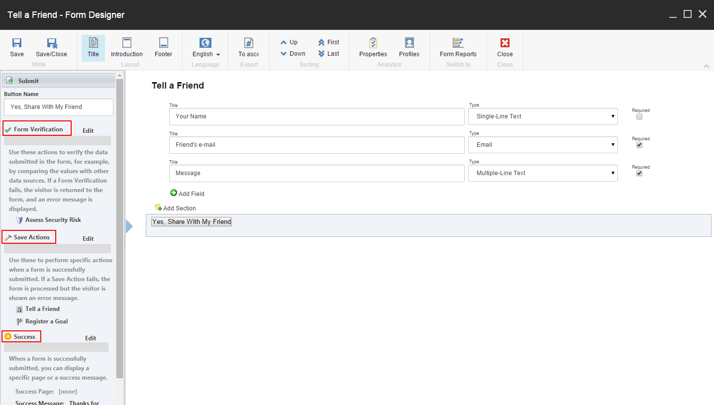 Click the Submit button and then click either Form Verification, Save Actions, or Success to open the relevant dialog box: