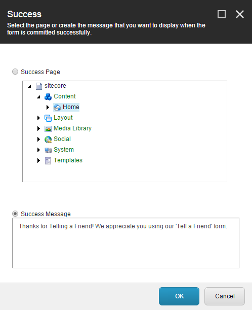 For a success action, either specify an alternative Success Page or enter the translated text in the Success Message field.