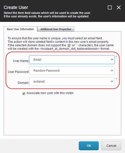 To map the User Name field to one of your web form fields, in the Create User dialog box, on the Basic User Information tab, click the User Name drop-down list, and click the form field that you want to map the User Name field to.