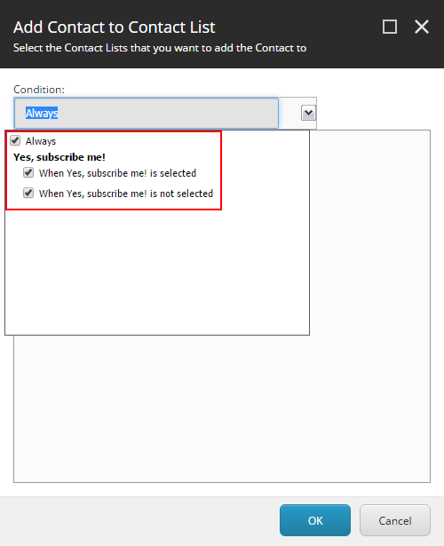 To select the conditions that describe when the contact should be added to a contact list, in the Condition field, click the drop-down list and select the relevant condition check boxes.