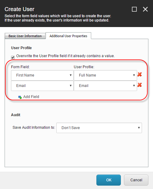 .NoteIf you select the Overwrite the User Profile field if it already contains a value check box, and the user already exists, all the form fields selected on the Additional User Properties tab overwrite the corresponding User Profile fields.