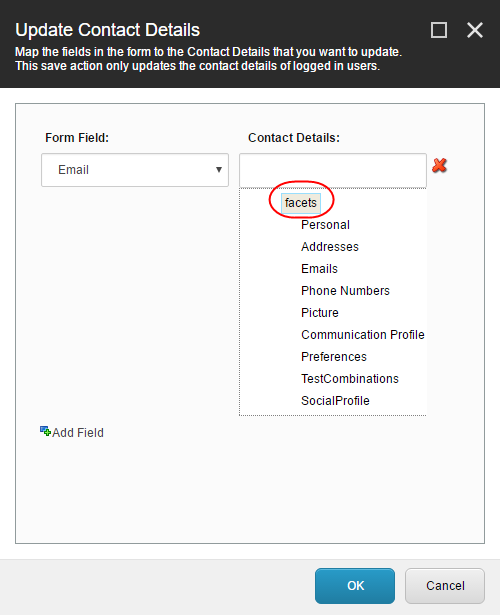 To map the selected form field(s) to the corresponding Contact Details field and facet that you want to update, click the Contact Details field, and in the drop-down list that appears, click facets.