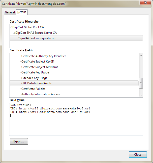 To open access to the Certificate Revocation Lists (CRL) Distribution Points, in your firewall, open the Certificate Viewer dialog. On the Details tab, in the Certificate Fields field, click CRL Distribution Points.