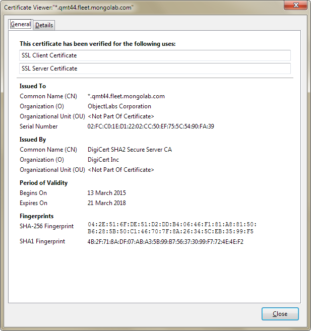 Connect to your MongoDB server using HTTPS, for example, https:// 0000-a0. 0000.fleet.mongolab.com:0000, and download an SSL certificate for your MongoDB database.