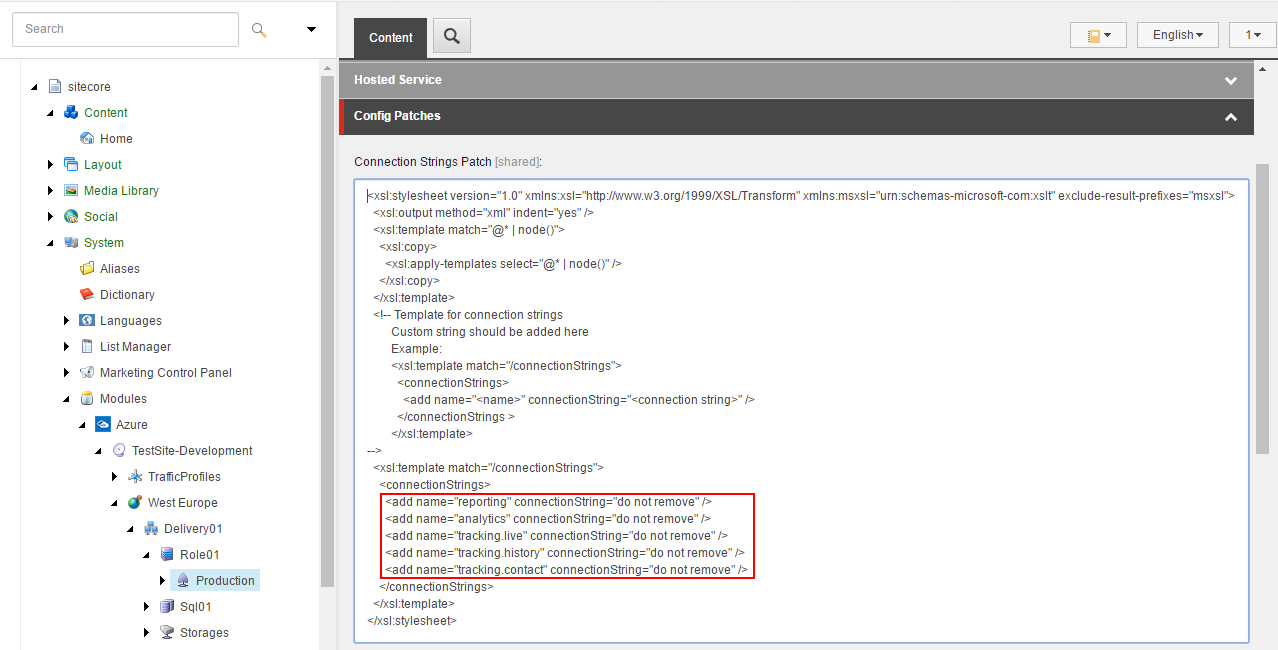 In the section, Configure the xDB Cloud client and connection to the xDB Cloud service, add all of the connectionString changes to your deployment in the Connection Strings Patch field, instead of the