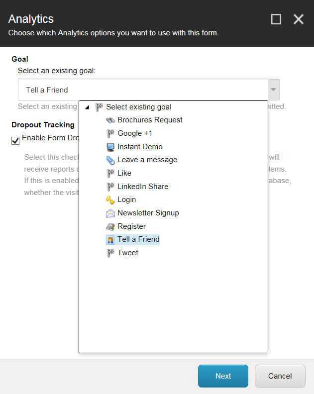 In the Analytics dialog box, in the Goal field, click the drop-down list and select a goal that you want to associate with the form.