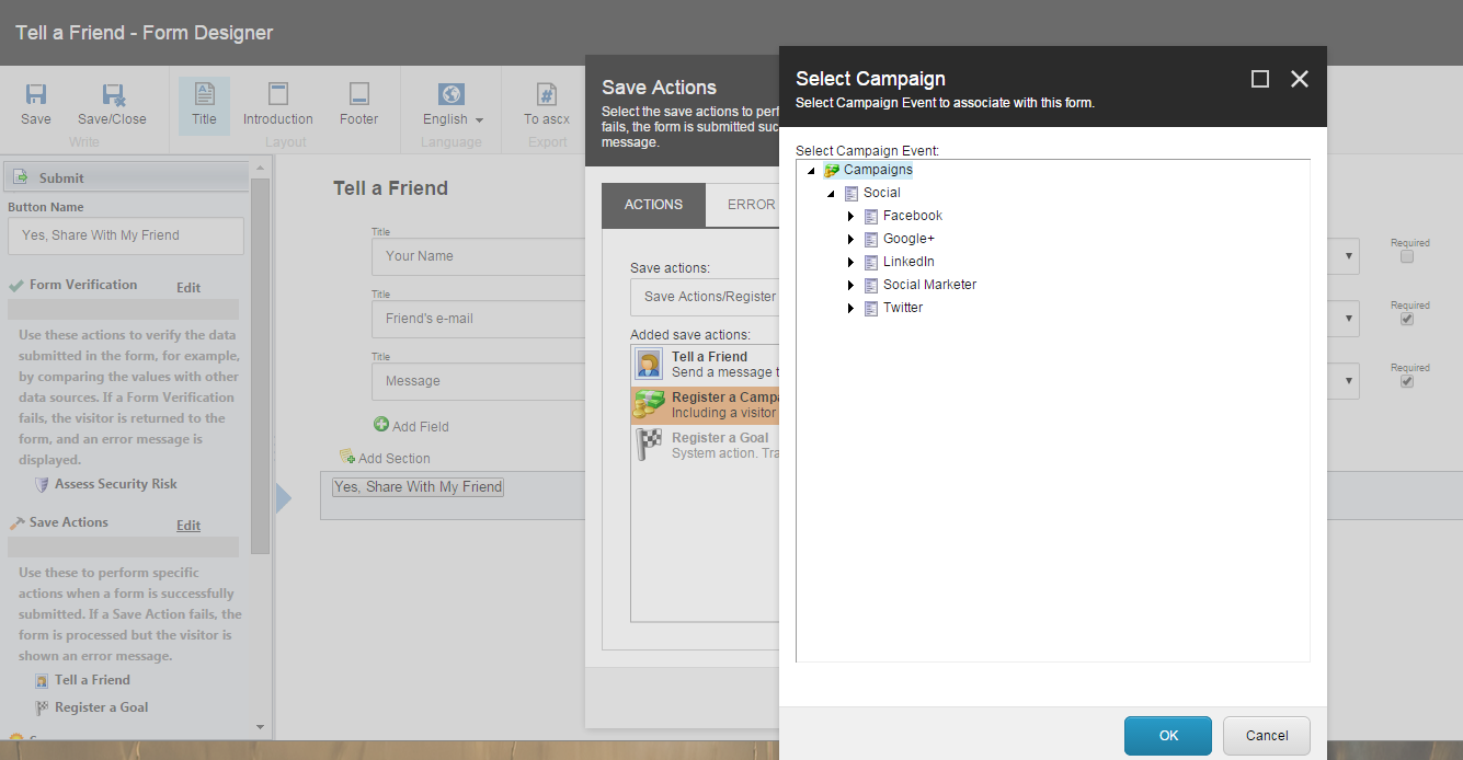 To trigger a campaign event upon form submission, you must add the appropriate Register Campaign action to the form’s Save Actions list.