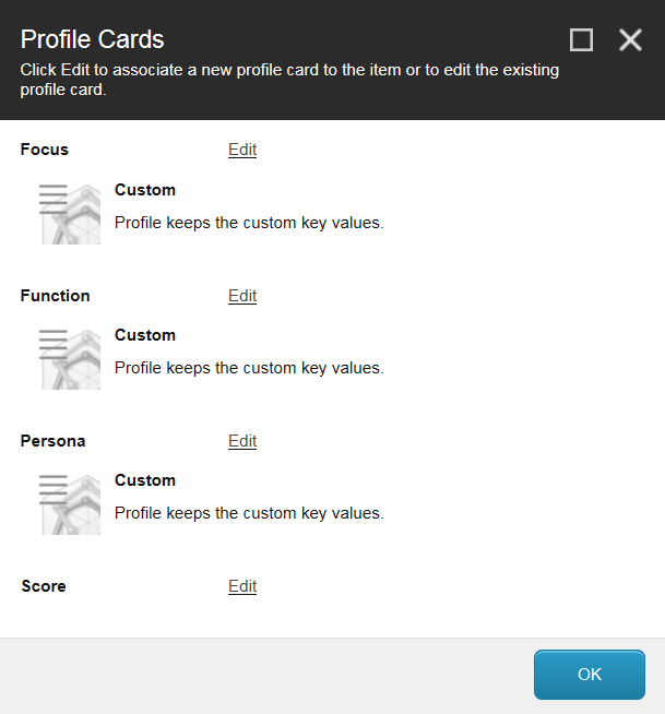 In the Profile Cards dialog box, click Edit to associate a new profile card with the respective item.