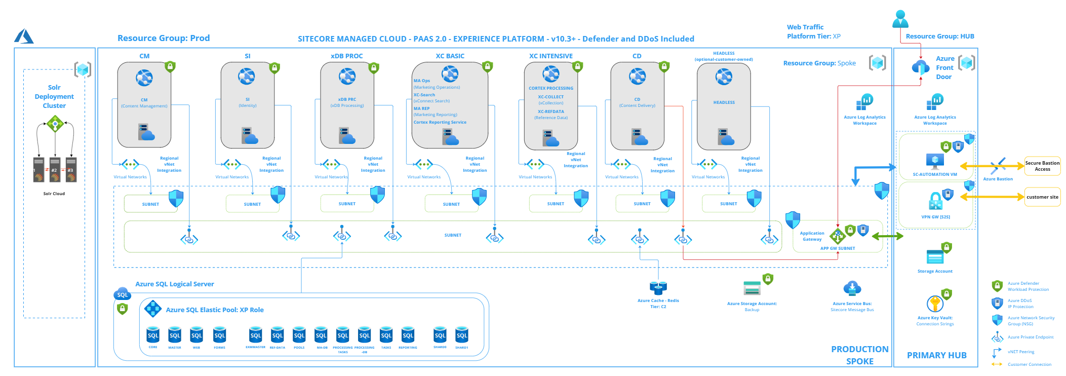 Sitecore Managed Cloud comes with a comprehensive infrastructure design, including all components necessary to run Sitecore Experience Manager and Sitecore Experience Platform at scale. The Managed Cloud layouts are similar across different sizes and topologies.