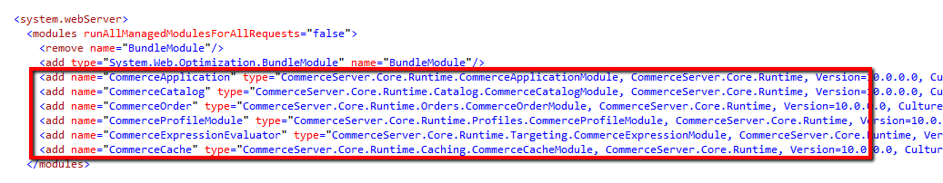 Because there now are Sitecore pipeline processors that perform all of the same actions as the http modules, you do not need to add the http modules to the web.config file. These pipeline processors are registered in the CommerceServer.config file, inside the initialize, preprocessRequest, and httpRequestEnd pipelines. Because these pipleline processors are part of the Sitecore configuration framework, you can patch out pipeline processors for subsystems that you do not use. For example, if you are using SCpbMD, you would patch out all of the pipeline processors except for catalog.