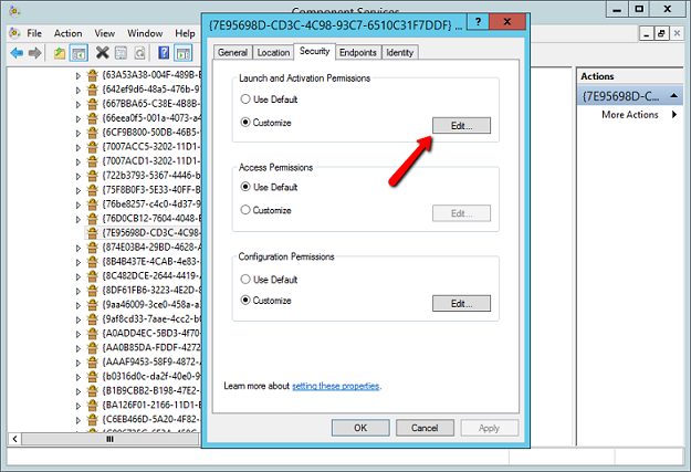 Click on the Security tab in the dialog. In Launch and Activation Permissions, click on Customize, and then click Edit.