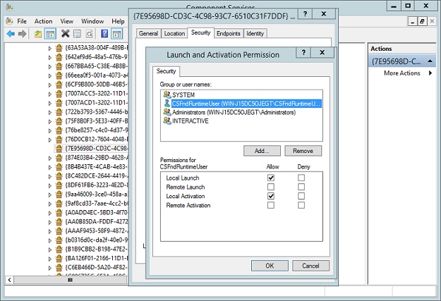 Add the user name of the application user of the Sitecore site, and then grant Local Launch and Local Activation permissions. Click OK, and then click OK again to complete setting the permissions.