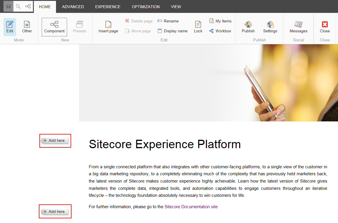 Open the relevant webpage in the Experience Editor, and on the Home tab, in the New group, click Component.