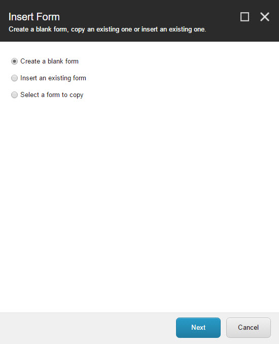 In the Insert Form wizard, select Create a blank form, and then click Next.