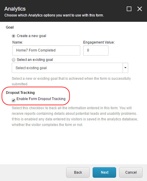 If you want all the information entered in the form to be tracked, regardless of whether the visitor completes the form or not, in the Dropout Tracking section, select Enable Form Dropout Tracking, and then click Next.