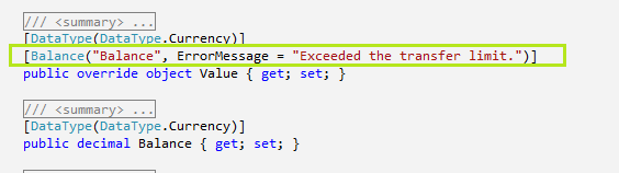 BalanceAttributeclass, you can use the following code sample:RequestResponse/// <summary> /// The balance validator. /// </summary> public class BalanceAttribute : DynamicValidationBase { /// <summary> /// Initializes a new instance of the <see cref="BalanceAttribute"/> class. /// </summary> /// <param name="balanceProperty"> /// The balance property. /// </param> public BalanceAttribute(string balanceProperty) { Assert.ArgumentNotNullOrEmpty(balanceProperty, "balanceProperty"); this.BalanceProperty = balanceProperty; } /// <summary> /// Gets or sets the balance property. /// </summary> public string BalanceProperty { get; set; } /// <summary> /// The get client validation rules. /// </summary> /// <param name="metadata"> /// The metadata. /// </param> /// <param name="context"> /// The context. /// </param> /// <returns> /// The <see cref="IEnumerable"/>. /// </returns> public override IEnumerable<ModelClientValidationRule> GetClientValidationRules(ModelMetadata metadata, ControllerContext context) { yield break; } /// <summary> /// The is valid. /// </summary> /// <param name="value"> /// The value. /// </param> /// <param name="validationContext"> /// The validation context. /// </param> /// <returns> /// The <see cref="ValidationResult"/>. /// </returns> protected override ValidationResult IsValid(object value, ValidationContext validationContext) { var fieldModel = this.GetModel(validationContext); var balance = fieldModel.GetPropertyValue<decimal>(this.BalanceProperty); var valueString = value as string; if (string.IsNullOrEmpty(valueString)) { return ValidationResult.Success; } decimal valueDecimal; decimal.TryParse(valueString, out valueDecimal); if (decimal.TryParse(valueString, out valueDecimal) && decimal.Parse(valueString) <= balance) { return ValidationResult.Success; } return new ValidationResult(string.Format(CultureInfo.CurrentCulture, this.GetErrorMessageTemplate(fieldModel), fieldModel.Title)); } -