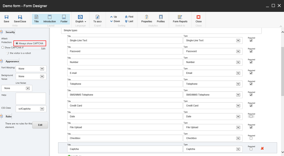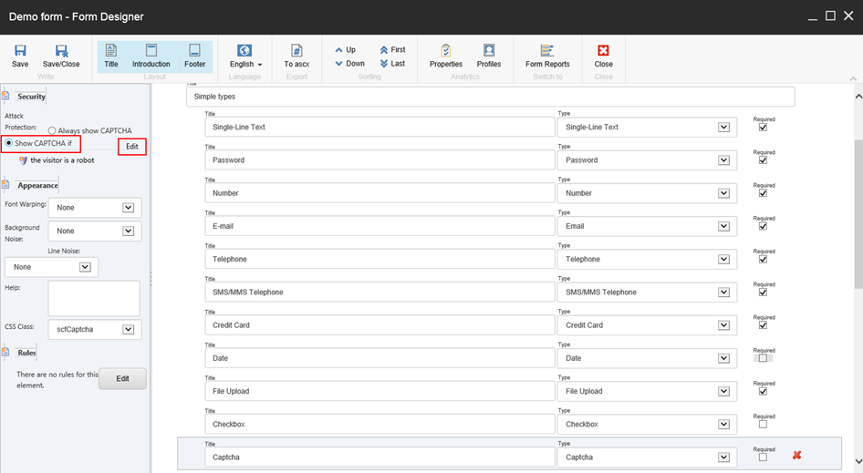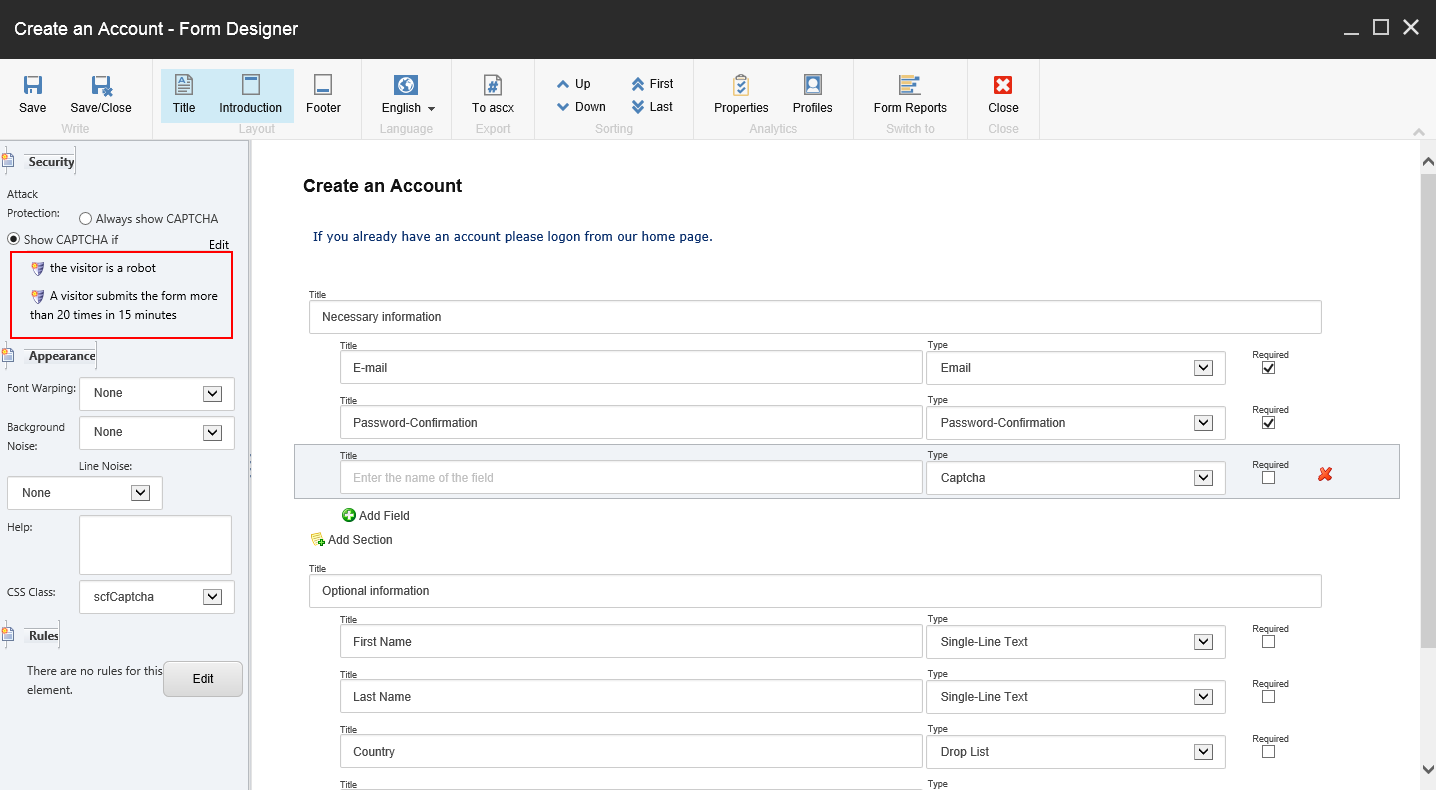 You can select the condition that must be fulfilled before the CAPTCHA field is displayed on the form.