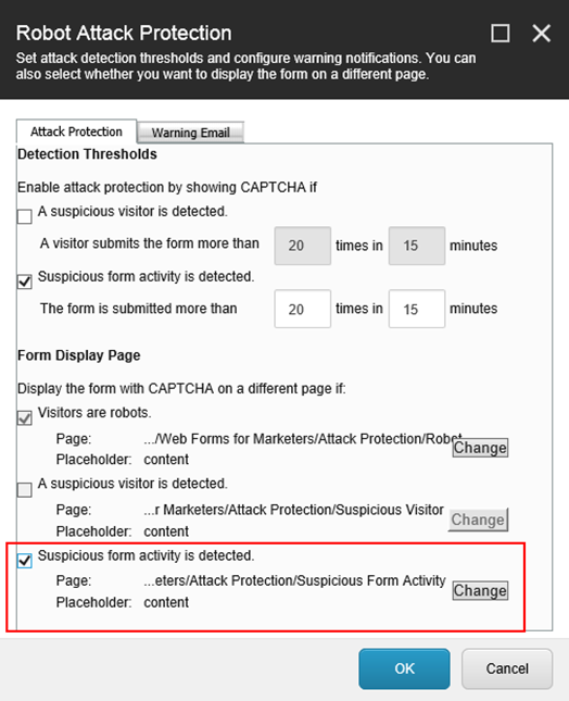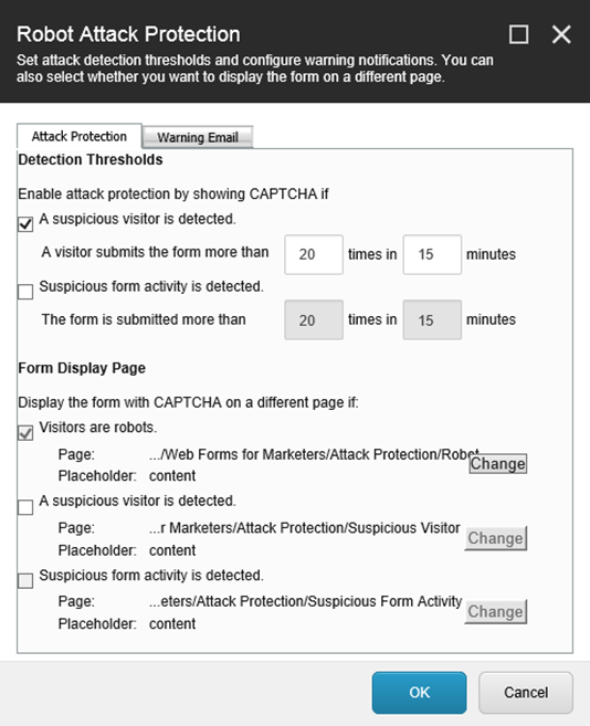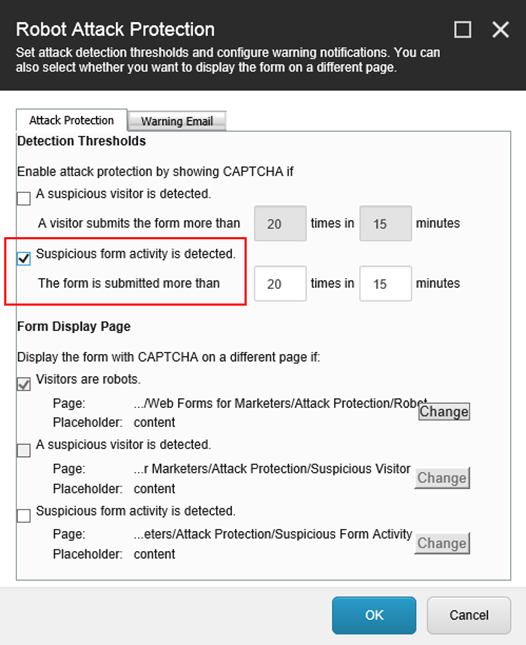 In the Robot Attack Protection dialog box, in the Detection Thresholds section, select a suspicious visitor is detected and enter the maximum number of times a visitor can submit the form and the time period.