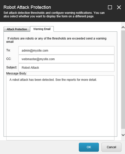 In the Robot Attack Protection dialog box, on the Warning Email tab, enter: