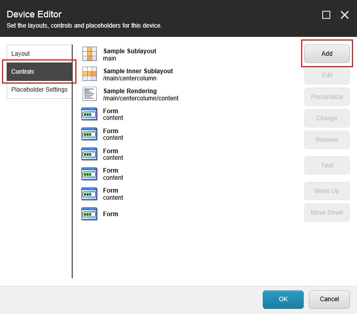 In the Device Editor dialog, in the left pane, click Controls and then click Add.