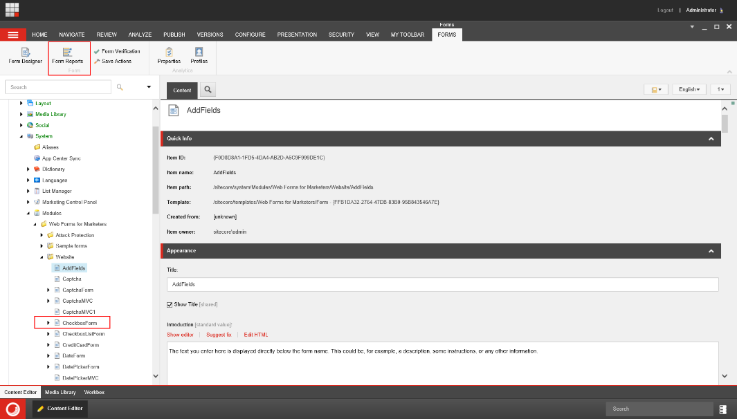 /sitecore/System/Modules/Web Forms for Marketers/Websiteitem and select the relevant form or field in a form. The Forms tab will appear in the ribbon. -