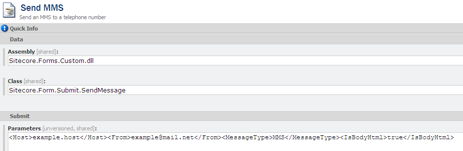 web.configfile, enter the following code into the Parameters field replacing "example" with the relevant host and email address:RequestResponse<Host>example.host</Host><From>[email protected]</From><MessageType>MMS</MessageType><IsBodyHtml>true</IsBodyHtml>