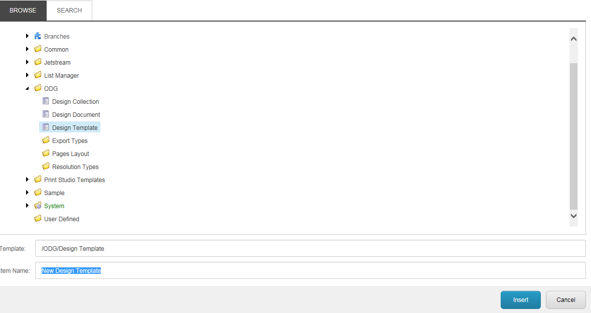 In the Sitecore Content Editor, click sitecore/ODG/ Design Templates and, on the ribbon, in the Insert group, click Insert from Template.