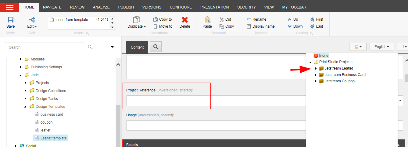 To make projects available for Design Manager and Document Publisher users, you must add a design template for the Print Studio project in Sitecore.