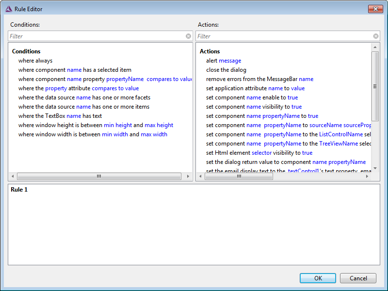 You add conditions and actions to a rule by double-clicking in the Conditions pane or in the Actions pane. This inserts the condition or the action in the Rule pane. If a condition or an action is already there, the new one is added. You can use the context-menu to remove conditions and actions from the Rule pane.