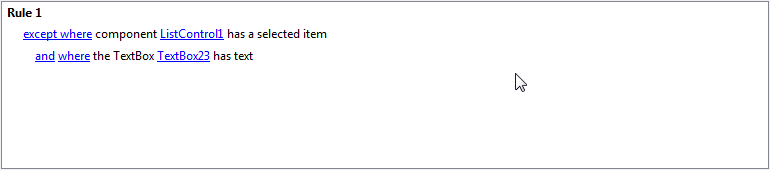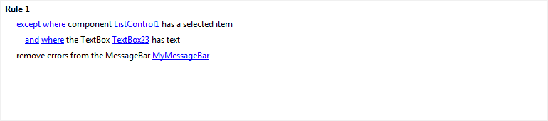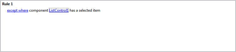 After you insert a condition like this in the Rule pane, you must edit it. The editor shows placeholders in blue. In this example, where and name are placeholders. You specify a value for a placeholder by double-clicking it.