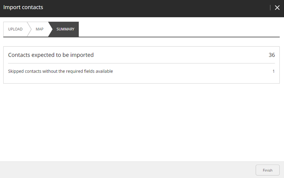 NoteThe Updated contacts shows the number of contacts in the import file that were already in the database and therefore only updated with any missing information.