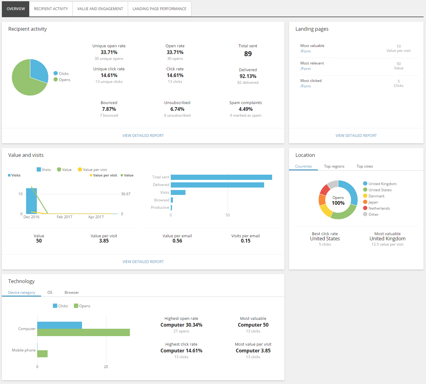 Overview – shows a summary of the reporting data on recipient activity, landing pages, value and visits, location, and technology.