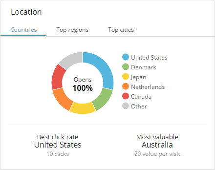 The location overview displays data collected about your email campaign according to country, region, and city.